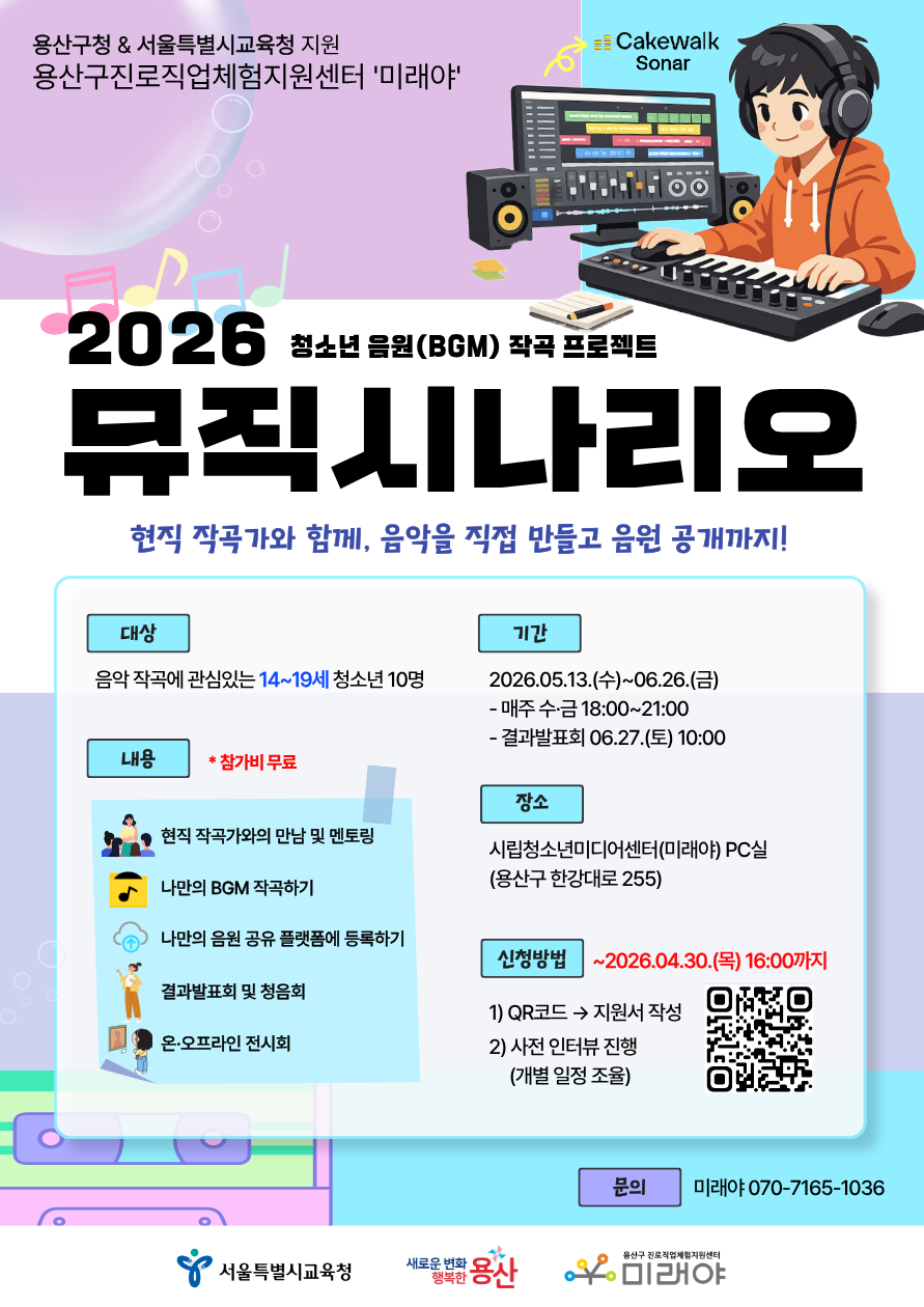 - [모집] 2026 청소년 음원 (BGM) 작곡 프로젝트 참가 청소년 모집!! ~4/30