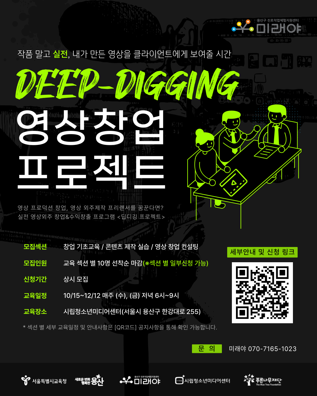 | "작품 말고 실전, 내가 만든 영상을 클라이언트에게 보여줄 시간" 용산구진로직업체험지원센터 '미래야'에서 영상 외주 프리랜서&창업을 꿈꾸는 청소년을 모집합니다. - 2025 프로젝트 미래야 : 딥디깅 창업 프로젝트 - 2025 딥디깅 프로젝트는? 영상 프로덕션 창업, 영상 외주제작 프리랜서를 꿈꾸는 청소년을 대상으로 진행되는 실전 영상외주 창업&수익창출 프로젝트입니다. 창업 기초교육 / 콘텐츠 제작 실습 / 창업 컨설팅&고객 유치 / 성과 발표회 [모집대상] - 중학교 3학년~고등학교 3학년 - 갭이어 및 대학생 청소년 - 영상 제작을 통해 수익 창출 및 창업을 꿈꾸는 청소년 - 서울시 및 수도권 거주자(미디어센터 오프라인 활동 가능한 자) [신청절차] 상시모집 1. 구글 폼 신청서 제출 2. 유선 1:1 인터뷰(개별 일정조율) 3. 교육 프로그램 참여 ※ 섹션 별 수업이 시작되면 신청이 어렵습니다. [교육일정] 10/15~12/12 매주 (수), (금) 18:00~21:00 [교육장소] 시립청소년미디어센터 (용산구 한강대로 255) [프로그램 섹션] ◆ 섹션① 영상 창업 교육 - 10/15(수)~10/22(수) (3회기) - 영상 창업의 이해, 비즈니스 모델 수립, 타깃/아이템 등 브랜드 포지셔닝 ◆ 섹션② 콘텐츠 제작 실습 - 10/24(금)~11/7(금) (5회기) - 외주영상 촬영 장비 이해, 클라이언트 수요 반영한 편집 실습 ◆ 섹션③ 영상 창업 브랜딩&컨설팅 - 11/12(수)~12/5(금) (8회기) - 창업 유형 및 방식 설정, 영업 전략과 고객 관리, 사업 운영 시뮬레이션 ◆ 성과발표회(★필수참여★) - 12/12(금) 19:00~21:00 - 레퍼런스 영상 및 사업(영업) 성과에 대한 개별 발표 ※ 가능한 모든 일정 참석 권장하오나, 일부 섹션 선택하여 교육 참여 가능합니다. [문의] 미래야 070-7165-1023 ![]() |