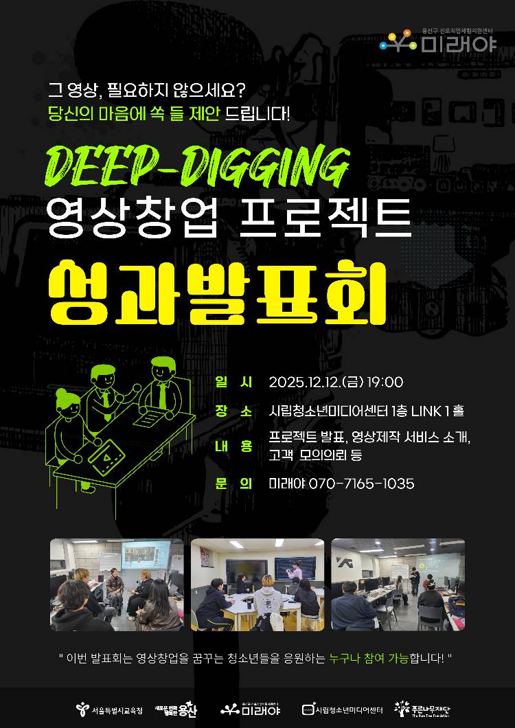 안녕하세요. 미래야입니다! 미래야에서는 10월 10일 첫 회기를 시작으로 영상창업을 꿈꾸는 청소년들을 대상으로 <딥디깅 영상창업 프로젝트>를 운영하였습니다. 총 18회기의 창업 브랜딩, 영상 편집 교육 등 긴 교육을 통해서 한층 성장하였을 청소년들의 성과발표회를 안내드리오니 참석하셔서 많은 축하와 따뜻한 격려 해주시면 감사드리겠습니다. * 일시: 2025.12.12.(금) 19:00~20:30 * 장소: 시립청소년미디어센터 링크1 * 내용: 프로젝트 발표, 영상제작 서비스소개, 고객 모의의뢰 등 * 문의: 미래야 070-7165-1035 이번 발표회는 영상창업을 꿈꾸는 청소년들을 응원하는 누구나 참여 가능합니다 :) 감사합니다. |