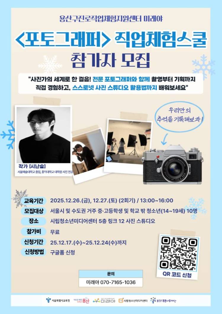 | 렌즈 속에 담는 나만의 특별한 순간! 사진으로 우리만의 추억을 기록해보자~! <직업체험스쿨> "사진가의 세계로 한 걸음! 전문 포토그래퍼와 함께 촬영부터 기획까지 직접 경험하고, 스스로넷 사진 스튜디오 활용법까지 배워보세요" ☆무료 특강☆ [세부일정 안내 및 신청링크] [모집대상] 서울시 및 수도권 거주 중·고등학생 및 학교 밖 청소년 (14~19세) 10명 [신청절차] 1. 구글 폼 신청서 제출 2. 접수 확인 (일정 확인 및 공지) * 개별 연락 예정입니다. 3. 프로그램 참여 [특강 프로그램 일정] 2025.12.26.(금), 12.27.(토) (2회기) / 13:00~16:00 [특강 프로그램 장소] 시립청소년미디어센터 5층 링크 12 사진 스튜디오 [프로그램 내용] - 프토그래퍼 직업 소개 - 카메라 그립법, 촬영 구도 연습 - 사진 촬영 ( 촬영 피사체 및 찰영 컨셉 기획 / 컨셉 기반으로 핏사체 및 소품 세팅 ) - 온라인 전시 기획 및 보정법 - 최종 결과물 공유 및 온라인 사진전 많은 참여 바랍니다.^^ [문의] 미래야 070-7165-1036